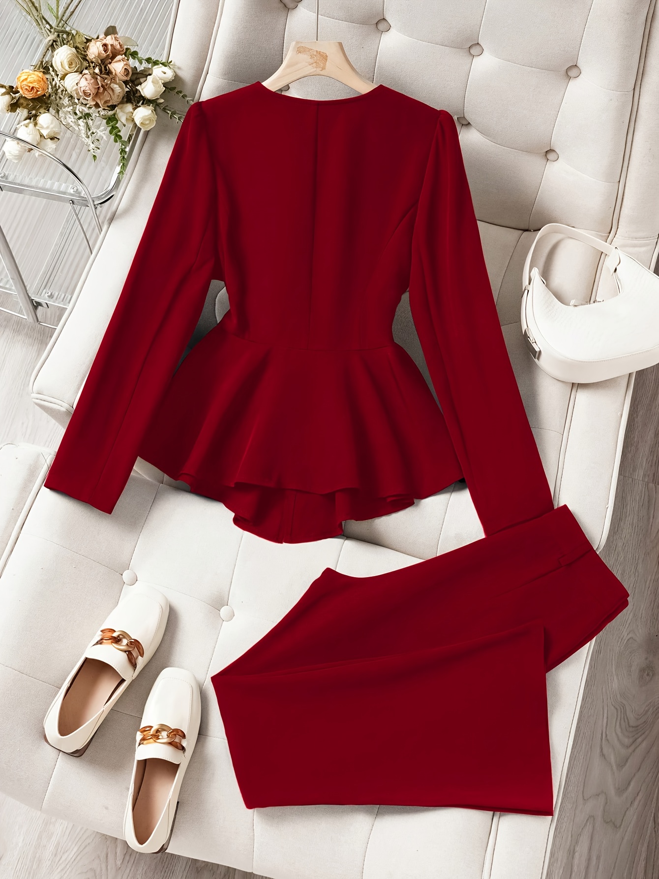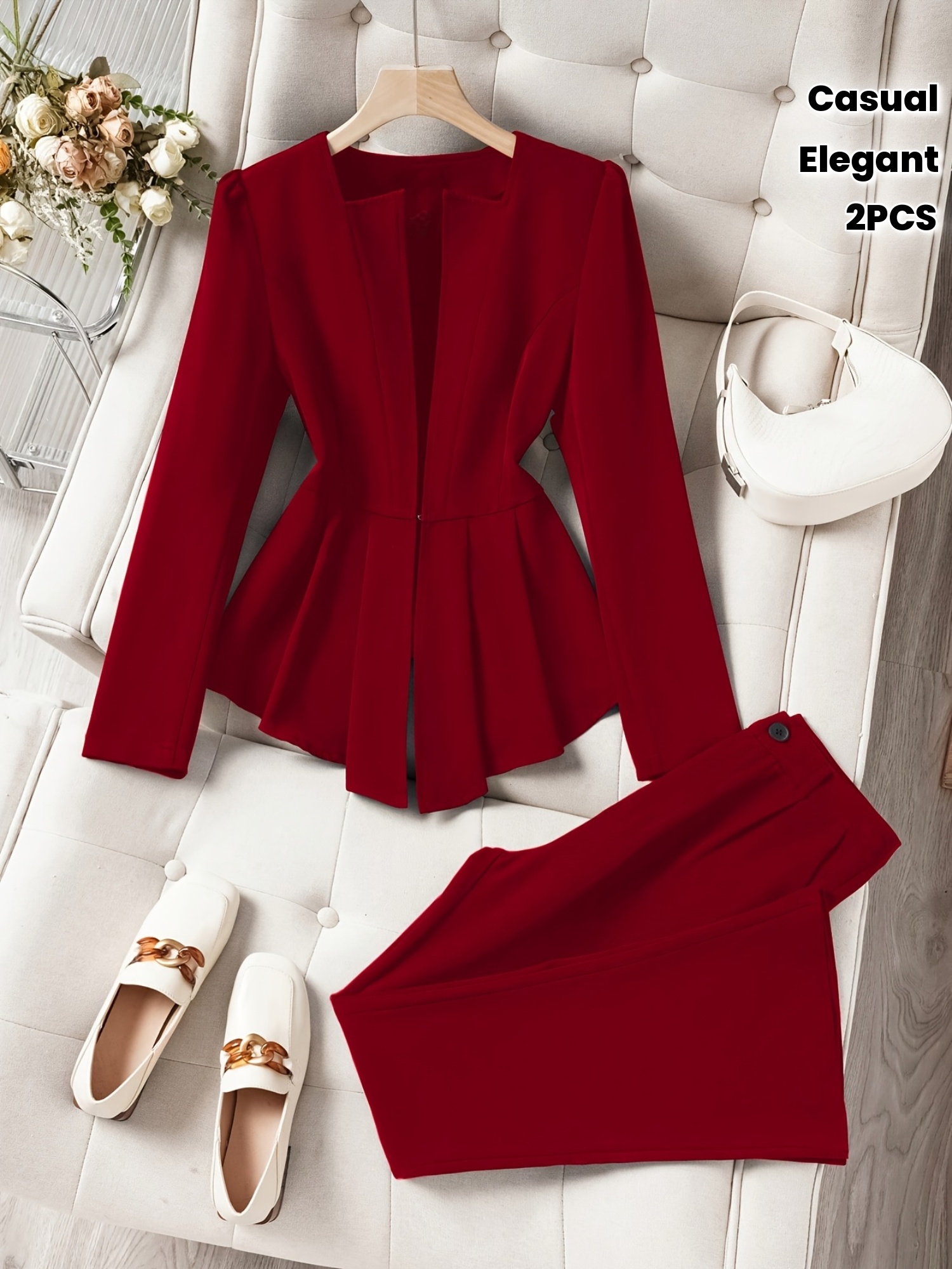 2pcs Set: Elegant Solid Color Ruffle Hem Blazer and Flared Pants, Casual Business Outfit