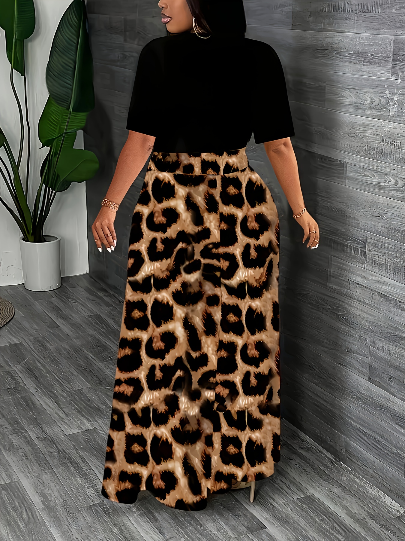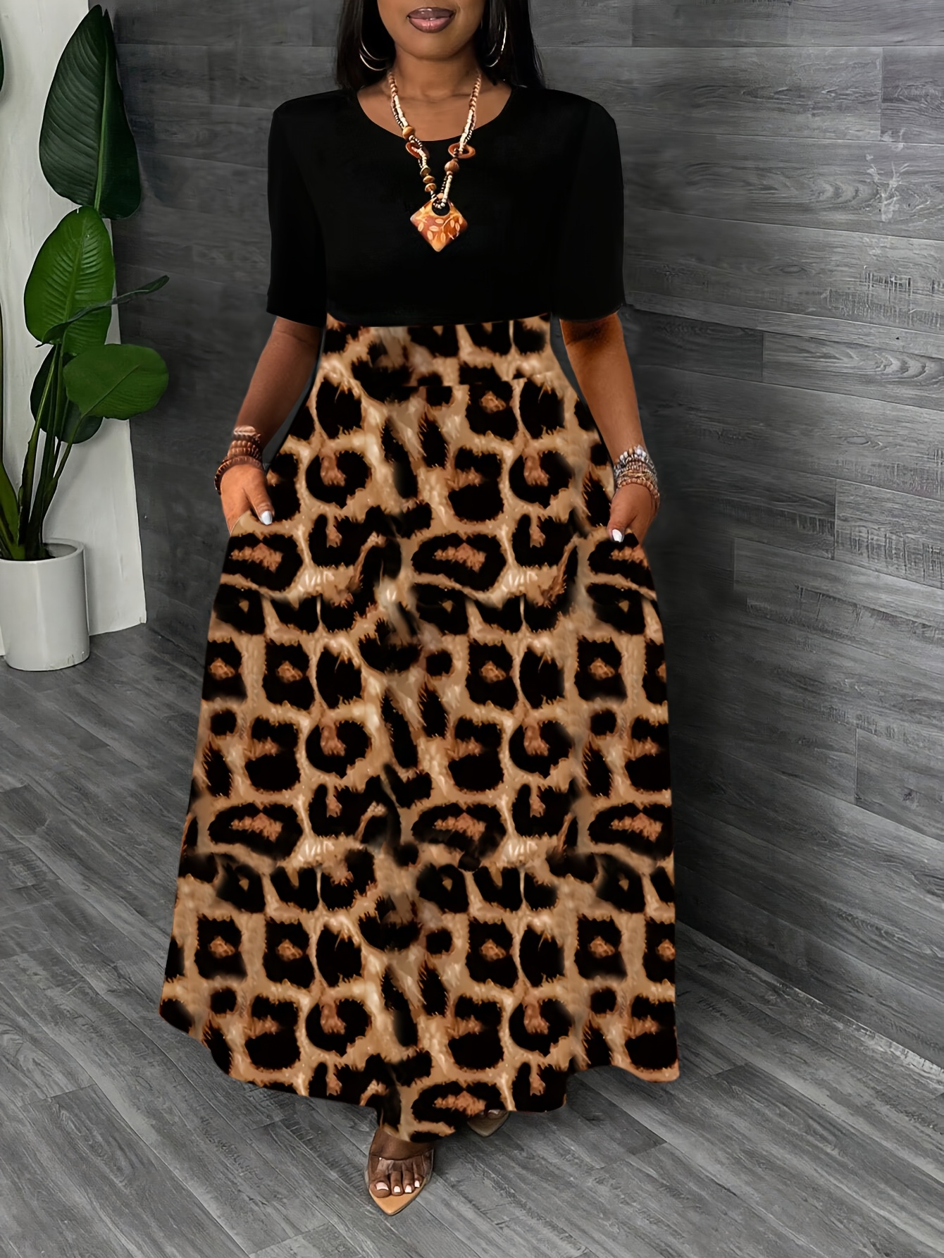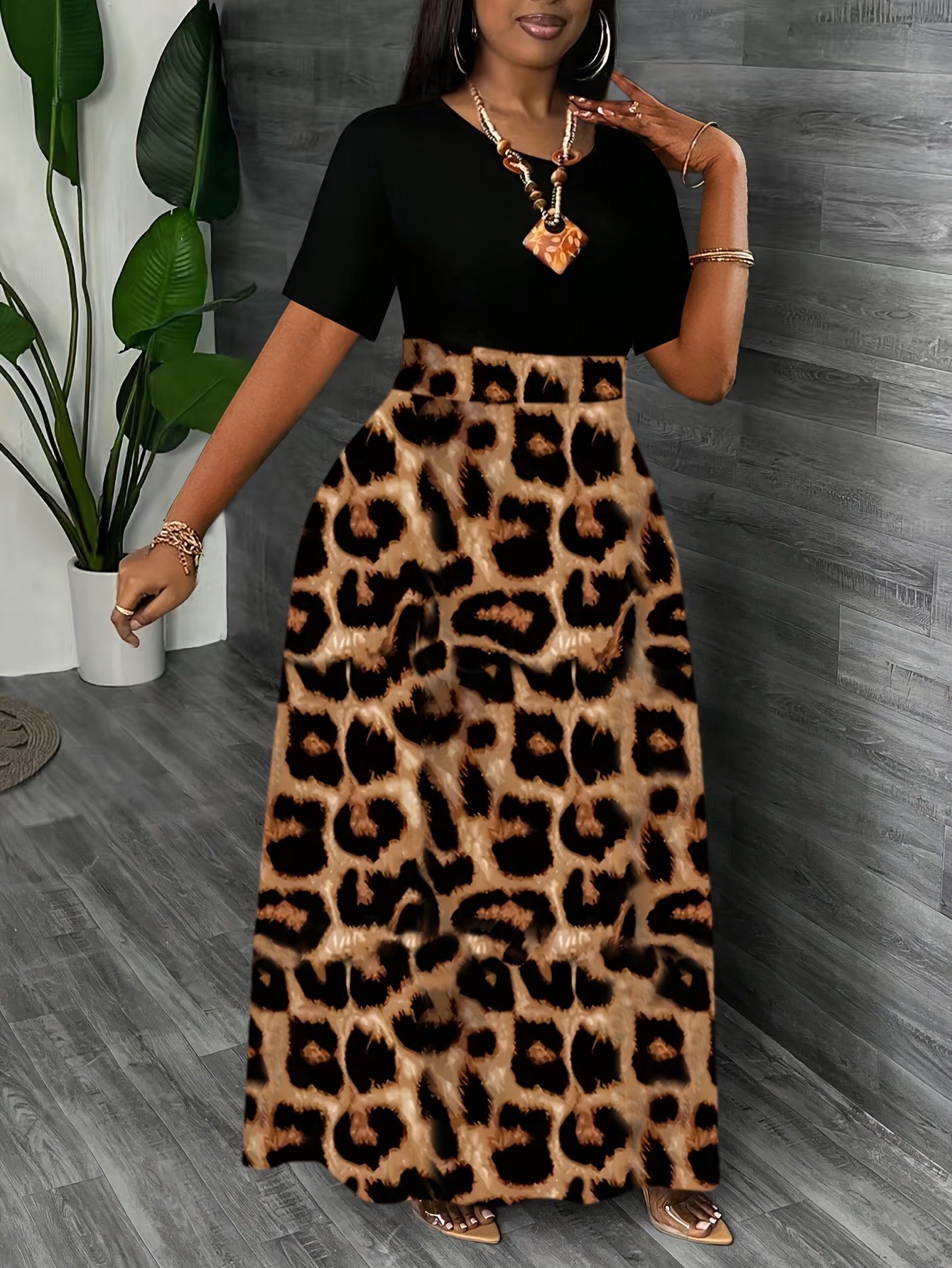 Elegant Leopard Print Maxi Dress - Color Block Design, Crew Neck, Short Sleeve, Stretchy Fabric, All-Season Wear for Women, Stylish Long Dres