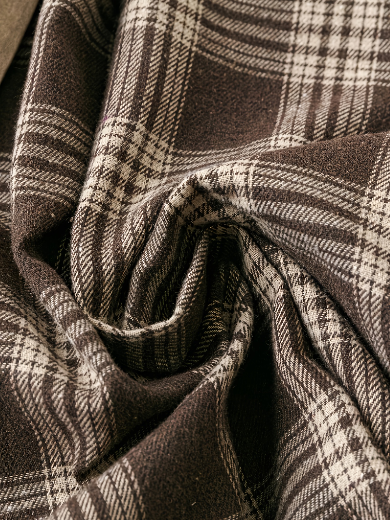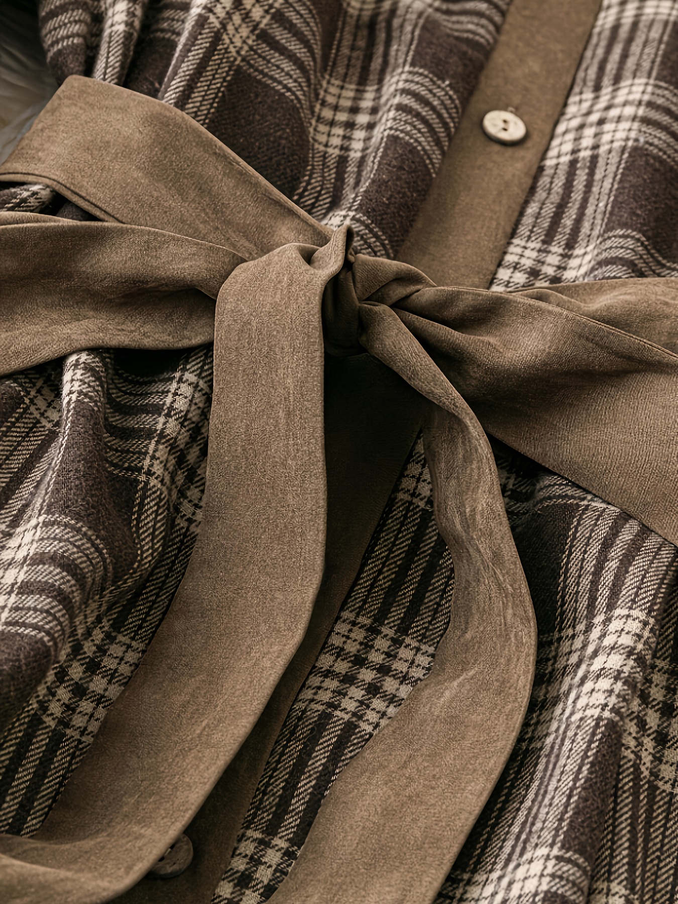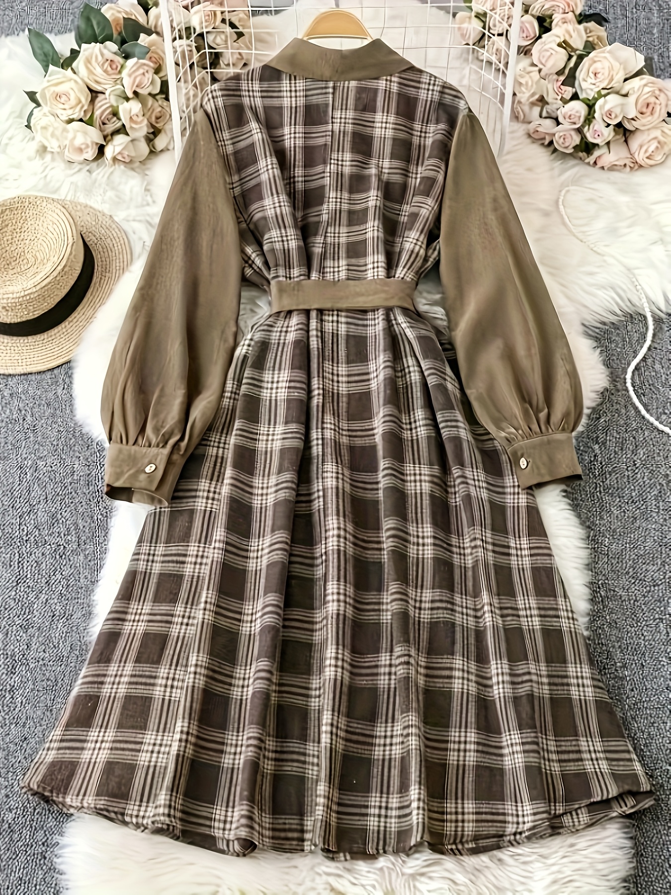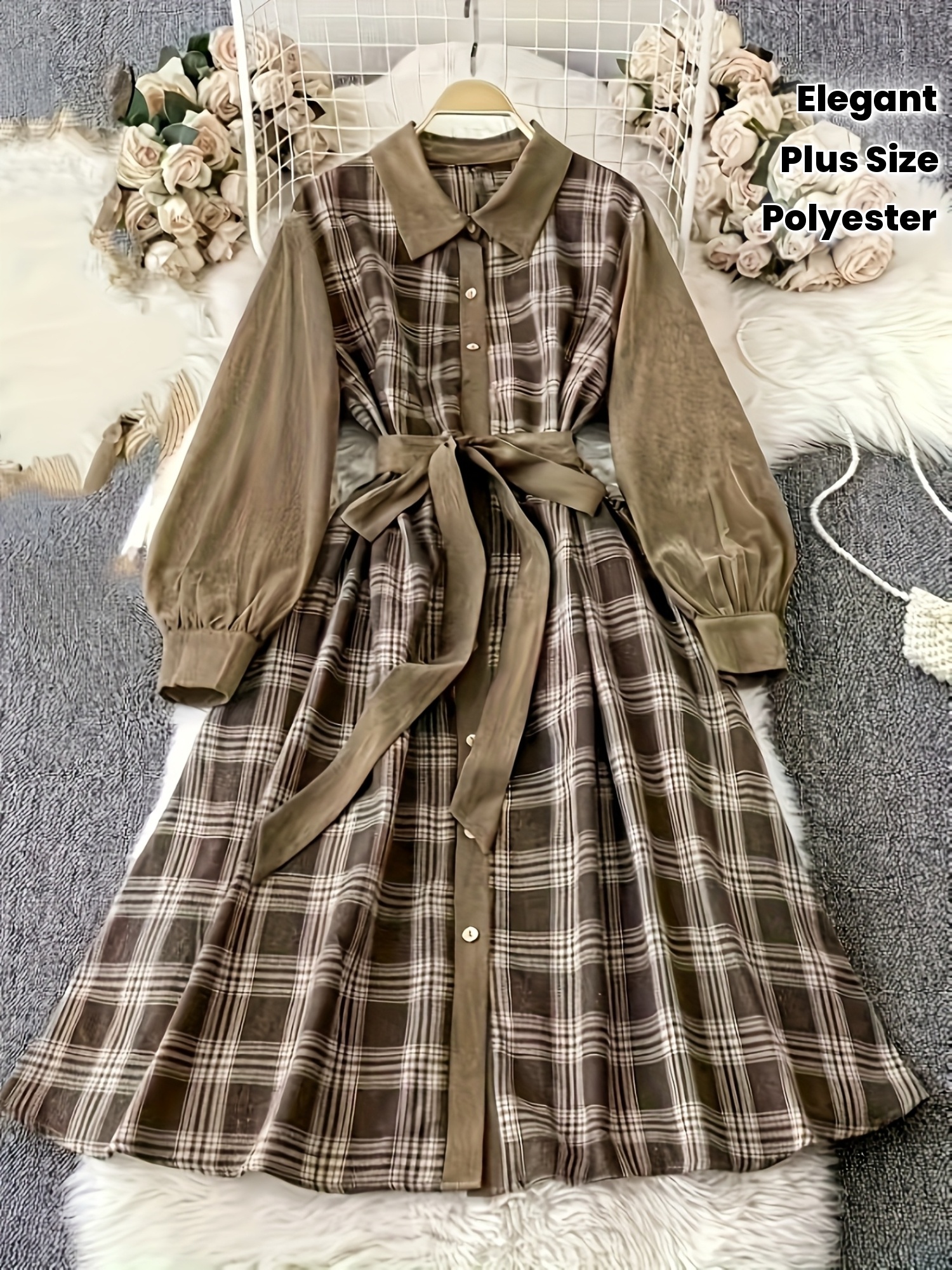 [Elegant Plaid Dress] Plus Size Elegant Women's Plaid Long Sleeve Dress | Brown & Beige Checkered Pattern, Contrast Collar, Button-Up Front, Flowy A-Line Silhouette - Perfect for Spring/Fall Casual or Formal Occasions, Polyester Fabric