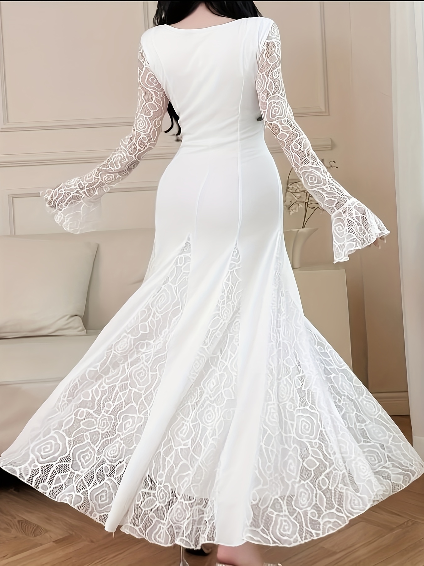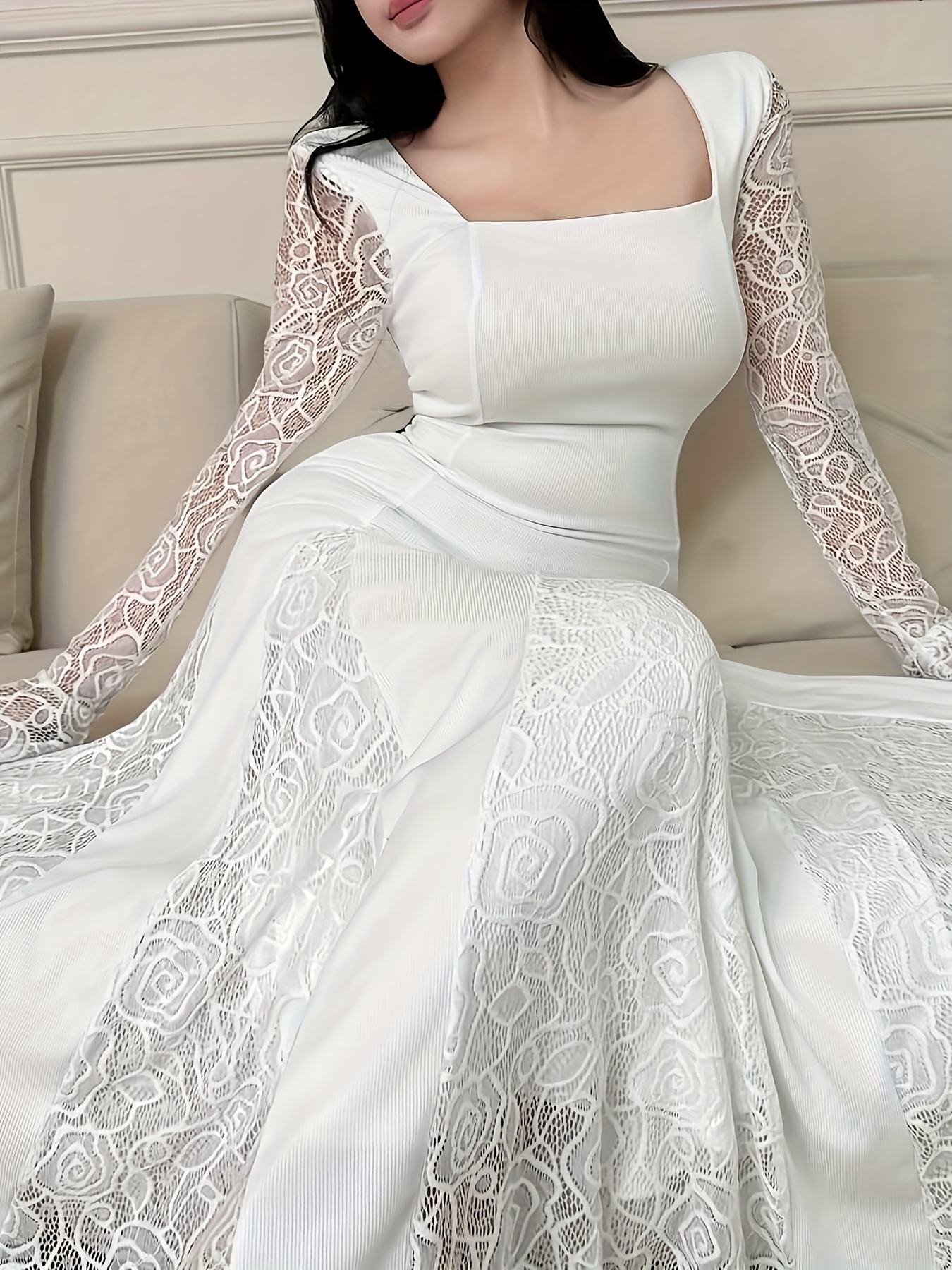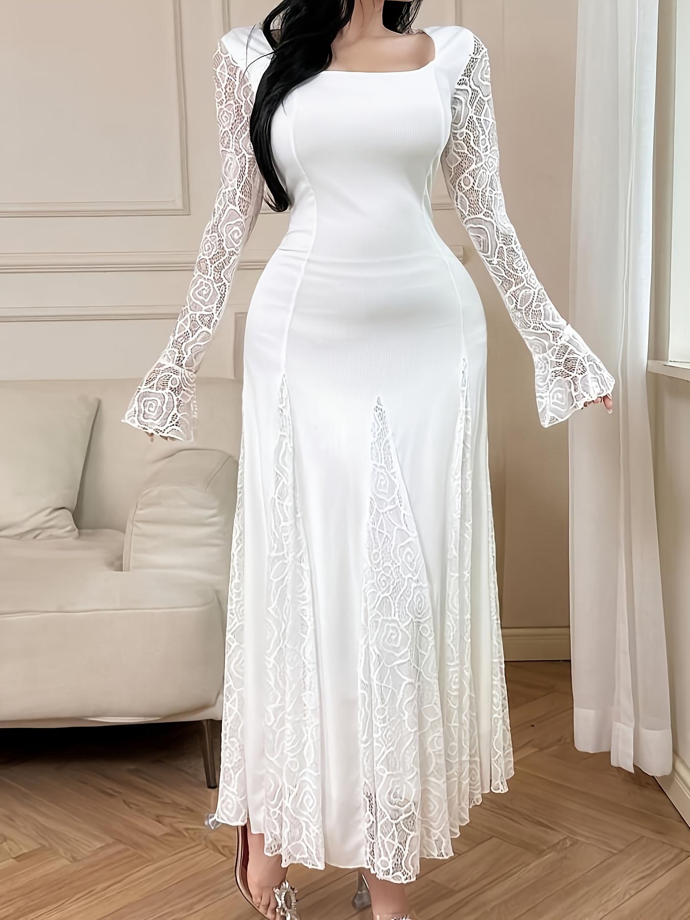 [Elegant Plus Size Dress] Elegant Plus Size Lace-Trimmed Long Sleeve Dress | White Bodycon with Floral Pattern, High Neck, Flowing Skirt, Stretchy Fabric - Perfect for Weddings & Formal Events