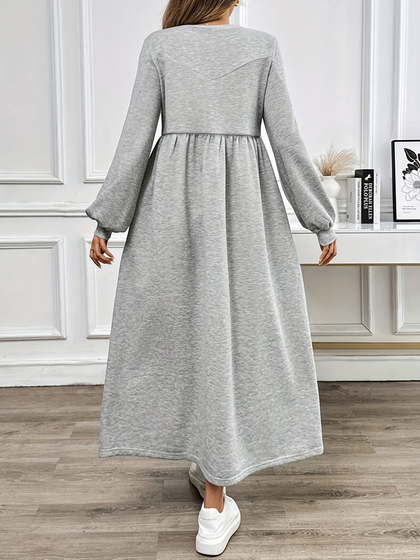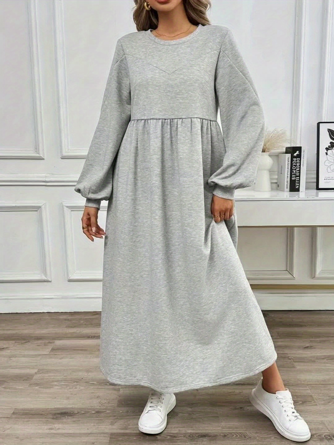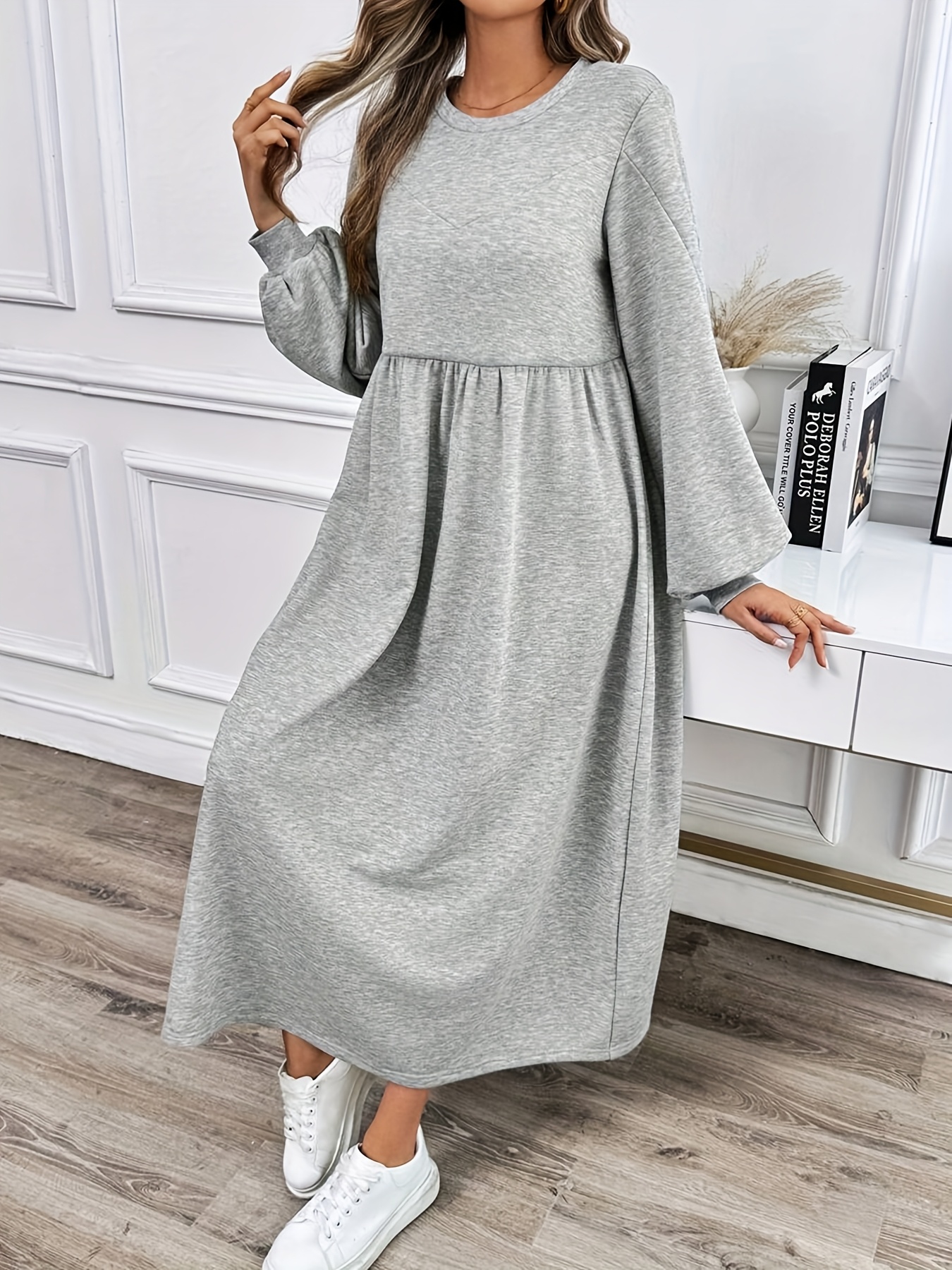 Plus Size - Women'S Casual Long Sleeve Dress - Light Gray, Loose Fit, Round Neck, Mid-Length, All-Season Comfort, Perfect for Weekend Outings, Casual Outing Attire | Relaxed Fit Dress | Comfortable Footwear