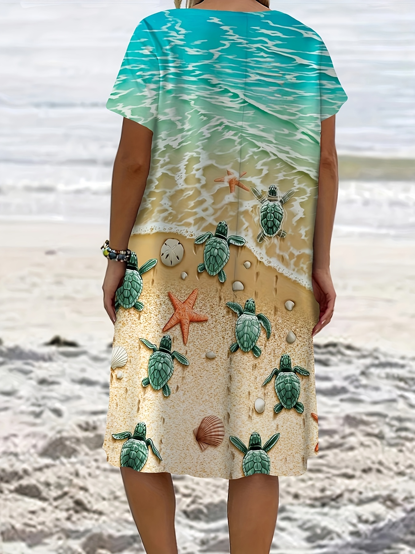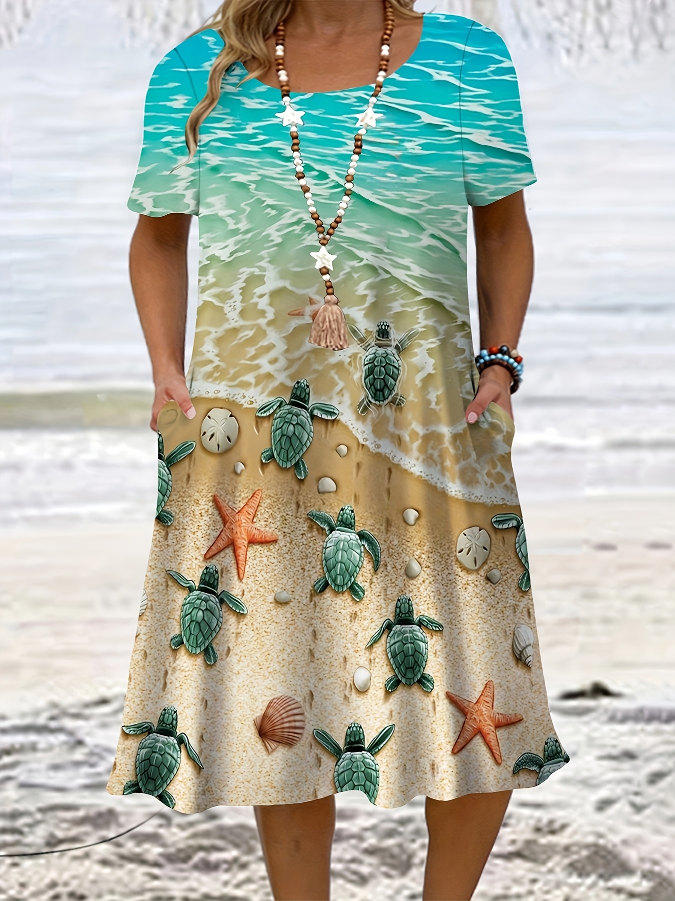 Plus Size Women's Tropical Marine Life Print Casual Dress - Soft Breathable Fabric, Loose Fit with Pockets, Vibrant Starfish & Turtle Design, Machine Washable for Spring Summer Fall Beach Outings, Beach Dress, Summer Outfit, Relaxed Fit