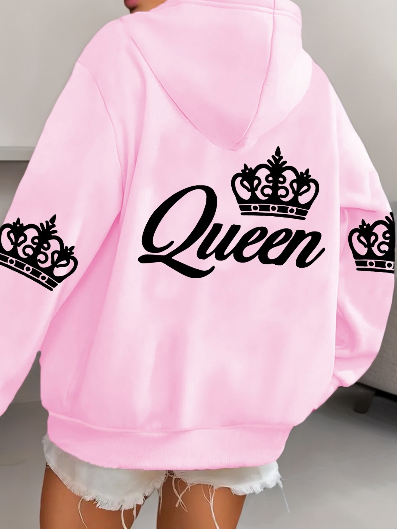 [Queen Crown Hoodie] Plus Size Women's Pink "Queen" Crown Print Hooded Sweatshirt | Zip-Up Casual Jacket with Fringe Detail | Long Sleeve Fall/Winter Hoodie