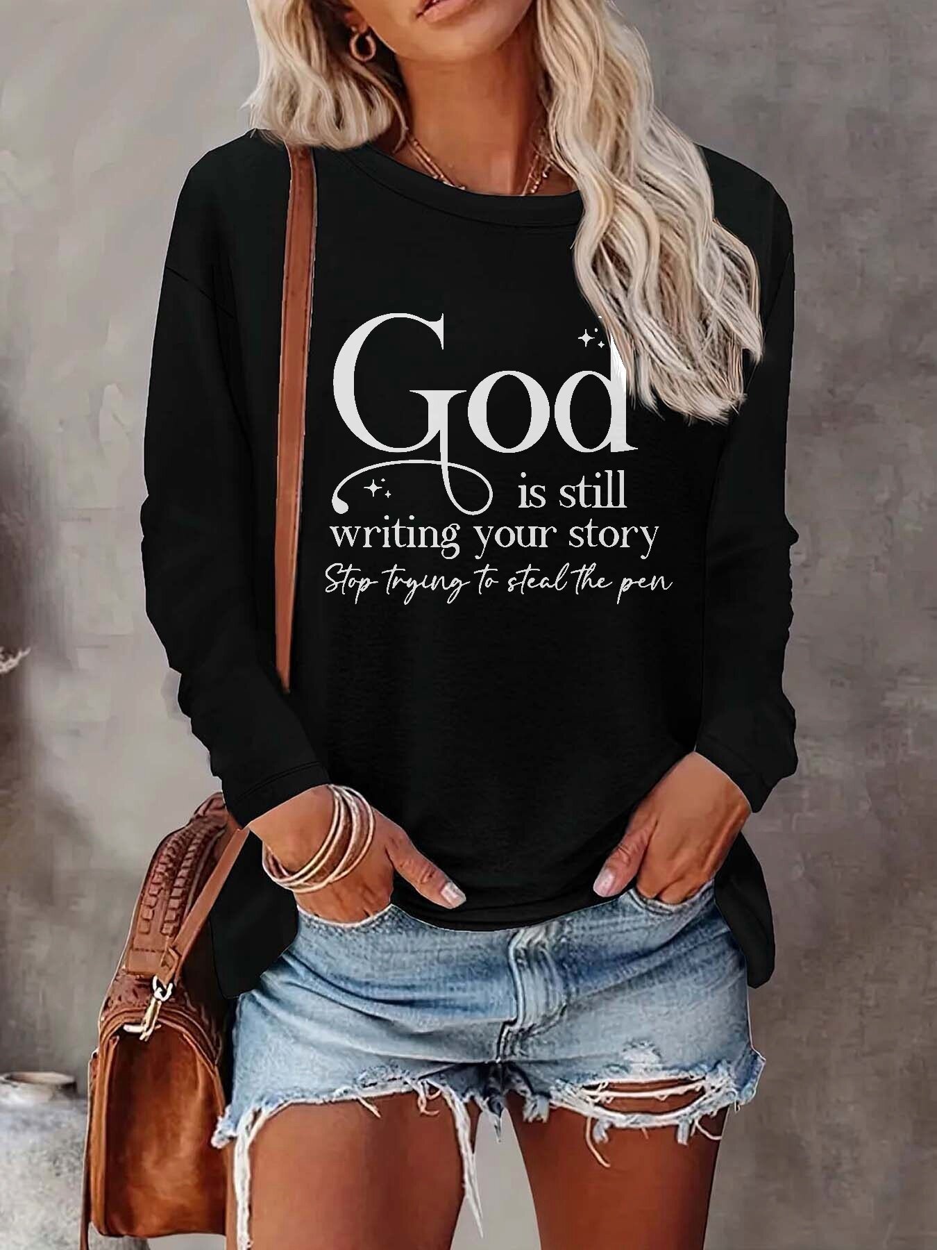 Women'S Casual Long Sleeve Crew Neck Top with Inspirational "God is Still Writing Your Story" Print - Black, Comfortable & Stylish, Perfect for Casual Attire, Everyday Comfort Top | Stylish Scripture Design | Medium Stretch Fabri