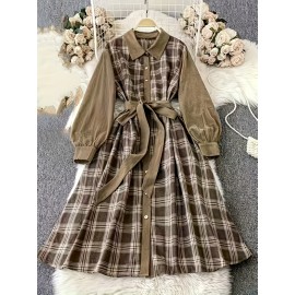 [Elegant Plaid Dress] Plus Size Elegant Women's Plaid Long Sleeve Dress | Brown & Beige Checkered Pattern, Contrast Collar, Button-Up Front, Flowy A-Line Silhouette - Perfect for Spring/Fall Casual or Formal Occasions, Polyester Fabric