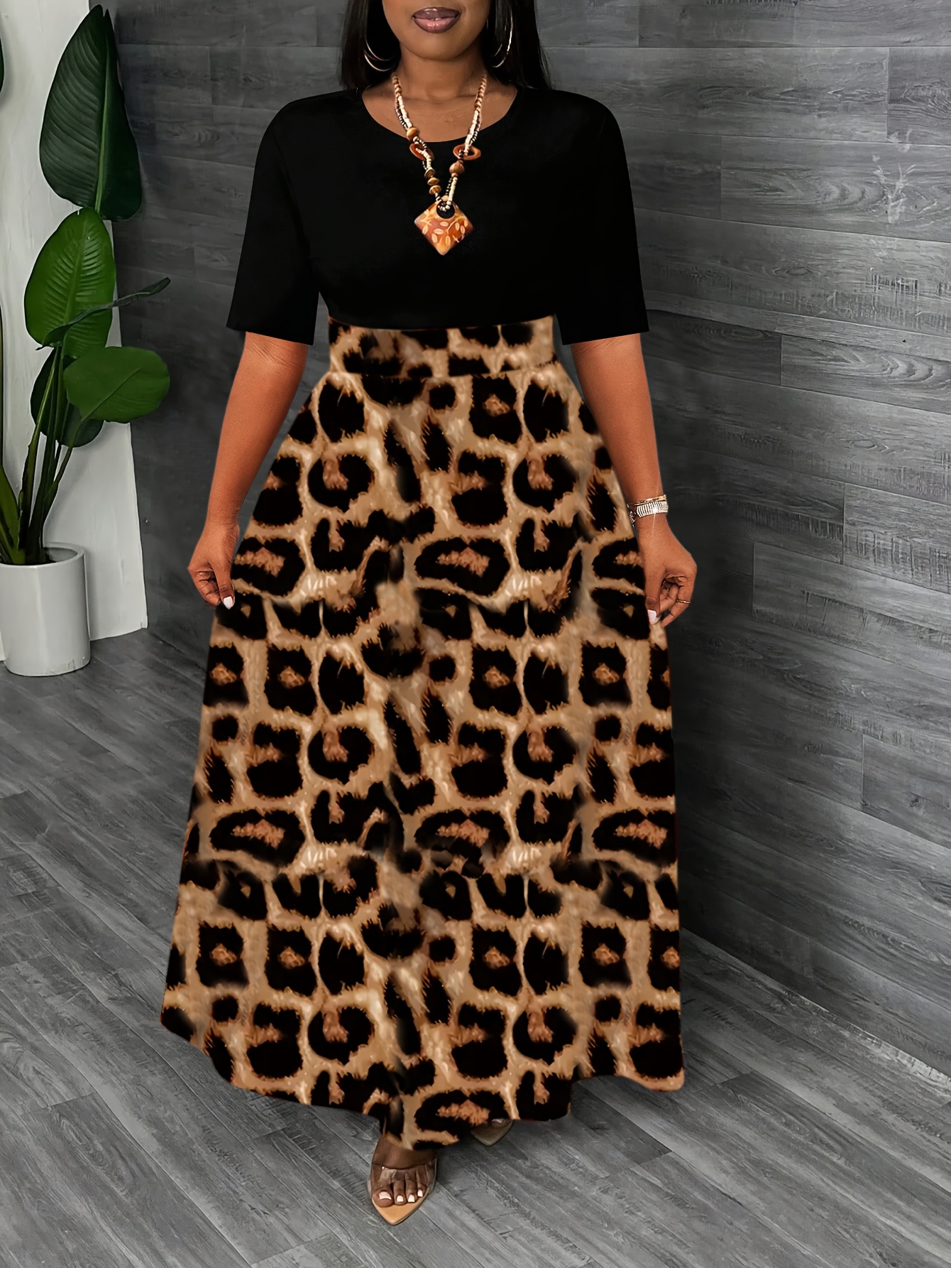 Elegant Leopard Print Maxi Dress - Color Block Design, Crew Neck, Short Sleeve, Stretchy Fabric, All-Season Wear for Women, Stylish Long Dres