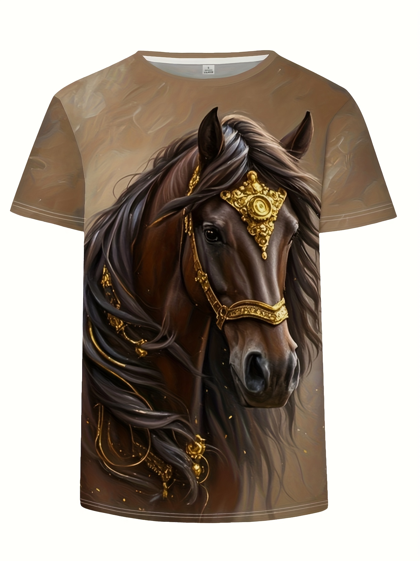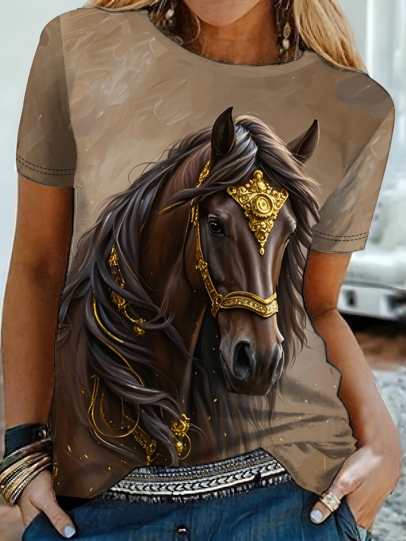Women's Casual Elegant Horse Graphic T-Shirt - Short Sleeve Round Neck Summer Top with Majestic Black Horse & Golden Bridle Design, Machine Washable Regular Fit, Horse Shirt, Comfortable Pullover, Regal Aesthetic Apparel, Detailed Digital Print