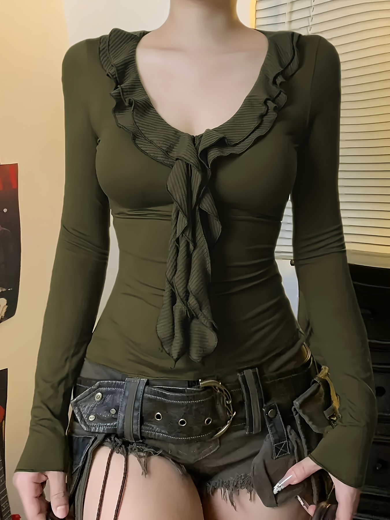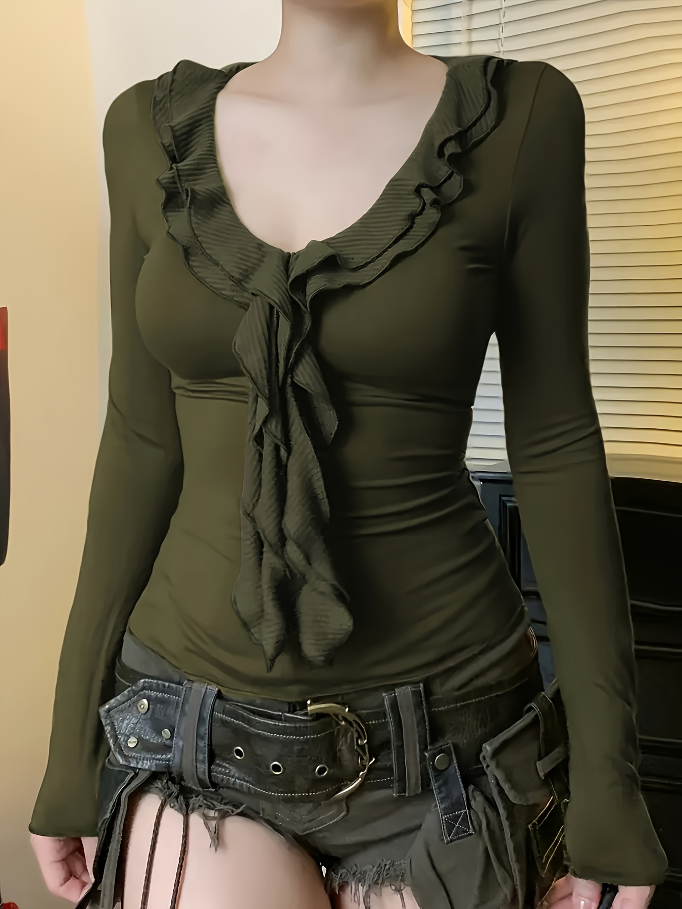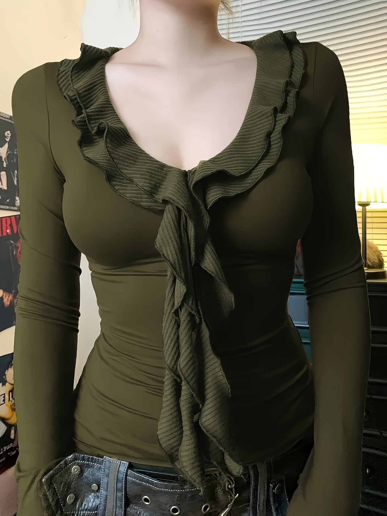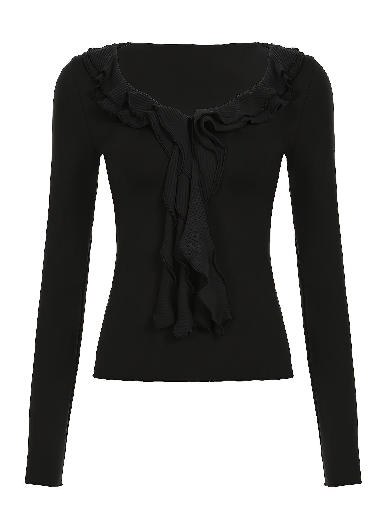 Women'S Vintage-Inspired Ruffle Trim Long Sleeve T-Shirt - Slim Fit, Black, Casual Style with Tie Waist Detail, All-Season Wear, Casual Wear Tee | Ruffle Detail Top | Glossy Texture